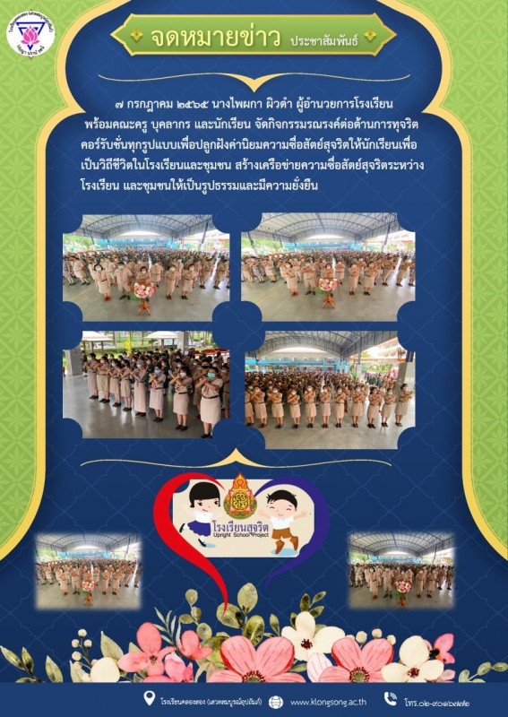 7 กรกฎาคม 2565 นางไพผกา ผิวดำ ผู้อำนวยการโรงเรียน พร้อมคณะครู บุคลากร และนักเรียน จัดกิจกรรมรณรงค์ต่อต้านการทุจริตคอร์รับชั่นทุกรูปแบบเพื่อปลูกฝังค่านิยมความซื่อสัตย์สุจริตให้นักเรียน